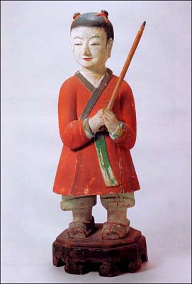 ÀÛÀڹ̻ó, Á¶¼± 18-19¼¼±â, ³ª¹«, °í 55.0 ¸Ó¸®À§¿¡ µÎ±ºµ¥¿¡ ¸Ó¸®¸¦ ¹¾î ÃѰ¢ÇÏ¿© µ¿ÀÚ»óÀÓÀ» ³ªÅ¸³»¾ú´Ù. µÎ ¼Õ¿¡´Â ¿¬ÀÙ À§¿¡ ²ÉµîÀ» ´ãÀº °ø¾ç¹°À» µé°í Àִµ¥, ¾Æ¸¶ ºÒÀü¿¡ °ø¾çÇÏ´Â ¸ð½ÀÀ» Á¶°¢ÇÑ °ÍÀ¸·Î »ý°¢µÈ´Ù. µ¿ÀÚ»óÀº ÁöÀåÀüÀ̳ª ¸íºÎÀüµî¿¡¼ ½Ã¿ÕÀÇ ¼öÇÏ·Î ¹èÄ¡µÇ´Â °æ¿ì°¡ ¸¹±â ¶§¹®ÀÌ´Ù. ¾ó±¼Àº ÀÔüÀûÀ¸·Î º¸À̵µ·Ï Á¶°¢µÇ¾ú´Âµ¥, ÈçÈ÷ À̸¶¿Í ÄàµîÀÌ ÇÑ Æò¸éÀ¸·Î º¸À̵µ·Ï À̾îÁ® ³»·Á¿À´Â °æ¿ì°¡ ¸¹À½¿¡ ¹ÝÇØ, ÀÌ µ¿ÀÚ»ó¿¡¼´Â µÎ ´«°ú ÄÚ ºÎºÐÀÌ º°µµÀÇ Æò¸éÀ¸·Î ó¸®µÇ¾î ´õ¿í ÀÔüÀûÀ¸·Î º¸ÀÌ°Ô ÇÑ´Ù. |