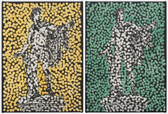 <과수원 하늘>(2018~2019) 시리즈도 마찬가지다. 크기와 모양, 색이 제가끔인 자개와 진주를 황동 가지가 살며시 움켜쥐고, 이를 다시 도금한 황동 프레임이 넝쿨과도 같이 감싸 안은 이 작품은 보석 세공만으로 이루어진 조각 작품으로, 벽 위에 드리워지는 그림자가 마치 드로잉처럼 회화적 멋을 더하고 있다.