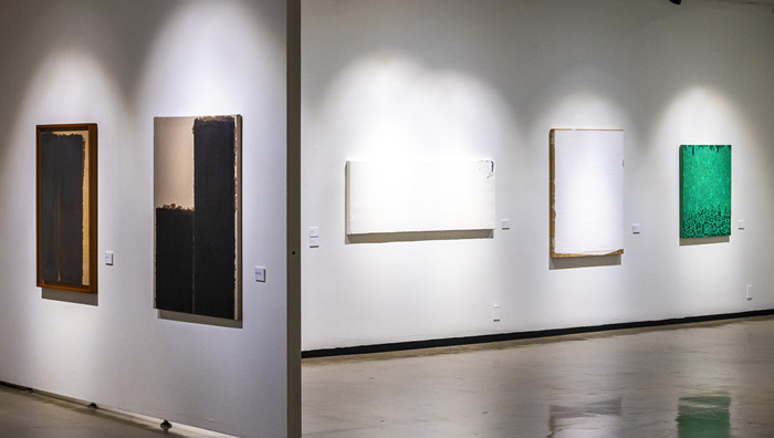 전시장에서 윤형근, 김창열, 박서보 등 대표적인 블루칩 작가들의 작품을 지나 처음 마주하는 회화는 바로 김근태의 ‘숨’과 ‘결’ 연작이다. 수백, 수천 번의 붓질이 거듭되며 붓결이 오롯이 새겨진 김근태의 대표 시리즈 ‘결’이 이번 전시에 내걸렸다. 그는 단색 물감을 바르고 말리고 또 바르기를 반복하며 동시에 마음은 비워내는 수행적 태도를 회화에 투영해왔다. 김근태의 그림은 화려한 꾸밈이나 수식 없이 담백한 단일 색을 띠고 있는 것 같지만, 한가지로 보이는 그 색상을 구현하기 위해 작가는 수 가지의 색상을 수십, 수백 번 층층이 뒤덮는다. 몇 겹이고 포개진 두터운 덧칠로써, 작품 표면에는 세필이 하나하나 훑고 지나간 듯 섬세한 붓결이 살아 움직이는 듯하다. 또 다른 대표작 ‘숨’에서는 돌가루라는 재료의 수용성을 존중하고 최소한의 개입으로 절제된 의식을 통해 칠을 반복하는데, 그 과정에서 물감이 캔버스 옆으로 흘러내리거나 돌가루가 캔버스 표면 위에 기포를 만들기도 한다. 이때 캔버스 천은 마포가 아닌 광목천을 사용하며 이는 돌가루의 물질적 질감을 더 도드라지게 해준다.