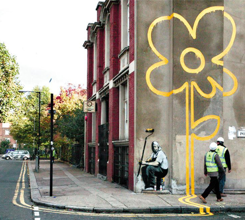 전 세계적으로 화제를 몰고 있는 영국 출신 예술가 뱅크시(Banksy)의 영향이 홍대에 상륙했다. 뱅크시는 대형할인매장 '테스코' 깃발을 향해 경례하고 있는 어린이, 애완견을 끌고 다니는 경찰, 노상 방뇨하는 근위대 등 사회 부조리를 고발하는 작품으로 주목받고 있는 그래피티(graffiti·낙서처럼 벽에 그린 그림) 예술가. 철저하게 얼굴을 공개하지 않고 남들의 눈을 피해 작업해 '게릴라 예술 테러리스트'로도 불린다. 최근 브래드 피트, 안젤리나 졸리, 크리스티나 아길레라 등 할리우드 스타들이 그의 작품을 소장하면서 인기가 치솟고 있는 상황.