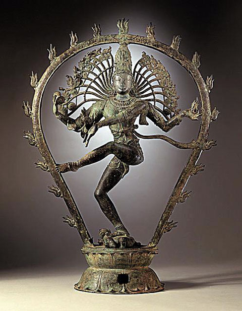 남인도의 촐라 왕조(9세기~13세기)에서는 청동으로 만든 춤추는 시바 신상(神像)이 자주 제작됐다. 힌두교의 신 시바는 죽음과 파괴를 상징한다. 여러 개의 손 중 한 손에 소고(小鼓)를 들고 너울대는 불꽃과 빛의 고리 속에서 춤을 추는 이 조각상은 '시바 나타라자(무용수의 왕 시바)'라고 불린다. 한쪽 발로는 납작 엎드린 악마의 등을 밟고, 한쪽 다리를 번쩍 들어 올려 빙글빙글 도는 시바의 춤은 시공(時空)을 초월해 우주의 에너지를 일깨우는 천지창조적 기능으로 여겨진다. 지칠 줄 모르는 그의 춤 동작이 시간의 흐름 속에서 우주의 창조와 파괴, 탄생과 죽음을 상징한다는 것이다.