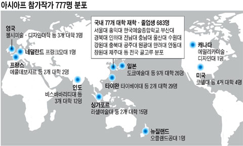 우선 《아시아프》는 참가 대학과 작가가 전례 없이 폭넓고 다양하다. 《아시아프》 참가작가 777명의 대학 분포를 보면 국내 대학 77곳, 해외 10개국 대학 28곳 등 총 105개 대학이 망라되어 있다.