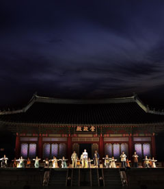 보름달 아래에서 뮤지컬을 본다. 경희궁에서 공연 중인 《대장금》이다. 이영애가 주연한 드라마를 바탕으로 했지만 지난해 초연과는 사뭇 다르다. 장금이의 멜로 라인 외에 조광조를 중심으로 한 권력의 이야기가 추가됐다. 노래(작곡 이지혜)는 현대적이고 장면 전개(연출 이지나)는 속도감이 있다. 《난타》의 도마질을 연상시키는 어선경연, 격구로 볼거리를 만들고 의상은 퓨전이다. 숭정전을 무대로 쓰고 품계석이 있는 마당에 객석을 설치했다. 바람이 불면 흔들리는 나무 그림자가 숭정전에 비친다. 리사 고영빈 조정석 등 출연. 30일까지 오후 8시 경희궁에서 공연한다. 15일은 쉰다. (02)738-8289