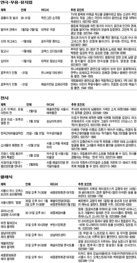 뮤지컬 《지하철 1호선》 4000회를 축하하는 독일 그립스 극장의 내한 공연 《공룡이 된 빌리》, 전국 각지의 공연장에서 음악으로 한 해의 마지막 밤을 수놓는 〈제야 음악회〉, 궁벽한 시골에서 태어나 붓 하나로 왕의 마음을 사로잡은 천재 소치(小癡) 허련(許鍊·1808~1893)을 조명하는 《소치 이백년, 운림 이만리》전(展). 이 밖에도 풍성한 공연과 전시가 여러분을 기다립니다. 조선일보 문화부가 월요일 아침 배달하는 '문화 상차림' 이번 주 메뉴입니다.