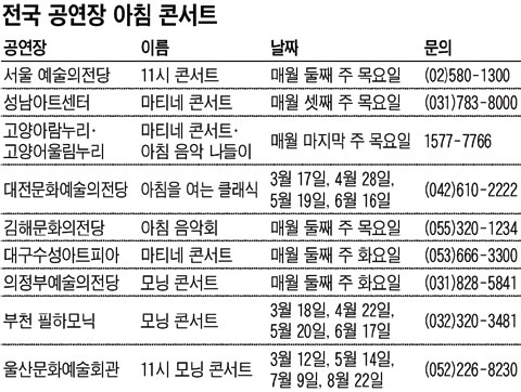 예술의전당 '11시 콘서트'를 기점으로 아침 콘서트의 인기는 성남·고양·의정부·부천·대전· 대구·울산·김해 등 전국으로 확산 중이다. 2006년 4월부터 '마티네 콘서트'를 열고 있는 성남아트센터는 연간 콘서트 티켓을 묶어서 20% 가량 싸게 판매하는 시즌권(券)이 인기다. 고양아람누리와 고양어울림누리는 각각 '마티네 콘서트'와 '아침 음악 나들이'라는 이름으로 홀수와 짝수 달 번갈아 가며 아침 음악회를 연다. 고양아람누리가 클래식 위주로 꾸민다면 고양어울림누리는 뮤지컬과 재즈, 뉴 에이지 등으로 관객들의 다양한 취향을 반영한다. 울산문화예술회관은 올해부터 현악사중주단 '콰르텟 엑스'를 이끌고 있는 조윤범씨가 '11시 모닝콘서트' 진행을 맡아 음악을 들려준다.