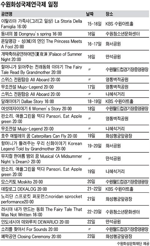다양한 부대행사도 준비돼 있다. 연극제 내내 KBS수원아트홀에서는 부모가 아이들과 함께 직접 연극을 만들어보는 교육연극워크숍이 진행되며 16일에는 '성(城)과 호수의 무대 활용 방안'을 주제로 학술세미나가 개최된다.