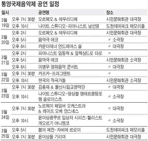 통영국제음악제의 공식 공연 프로그램은 16개. 음악제는 3월 25일 오후 7시 30분 통영시민문화회관 대극장에서 모든 프로그램이 윤이상의 곡으로 꾸며진 ‘음악+윤이상:윤이상을 기리며’로 막을 내린다.