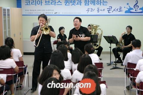 이어서 리더 안희찬씨가 유머 넘치는 말솜씨로 금관악기를 소개했다. 안씨가 호른을 가리키며 "가늘고 긴 관이 상당히 많이 꼬여 있죠? 그래서 호른 연주자들은 대체로 속이 좁아요"라고 하자 학생들은 까르르 웃음을 터뜨렸다. "저기 덩치 큰 악기는 튜바예요. 정말 크죠? 아주 낮은 음을 내는 악기입니다." 악기들이 하나하나 소개되는 동안 아이들은 눈을 크게 뜨고 설명을 들었다.