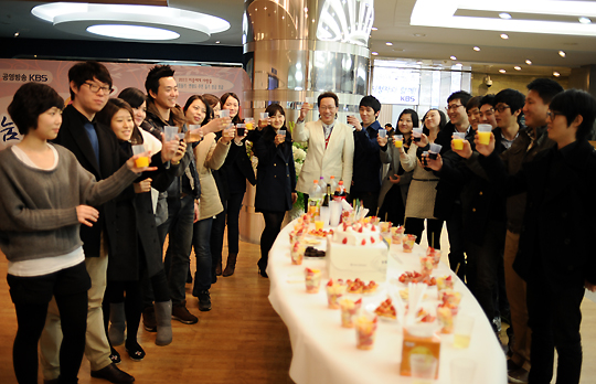 [사진. 조촐한 오픈행사를 갖고 있는 디자인 팩토리 회원들과 전재현 교수(가운데)]