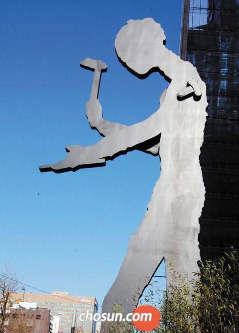 서울 신문로 흥국생명 사옥 앞에 서 있는 조나단 보롭스키의 ‘망치질하는 사람’. / 이태경 기자 ecaro@chosun.com
