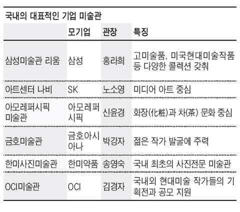 기업에서 운영하는 미술관을 재벌가 안주인들의 호사(豪奢)로 여겼던 것은 옛말이다. 현재 국내 기업미술관 오너들은 대부분 전문가적 지식과 체계적인 경영마인드로 무장, 미술계에 막강한 영향력을 발휘하고 있다. 미술관은 기업에 종속된 공간이 아니라, 모기업의 경영이념과 미래비전까지 가늠하는 '문화경영'의 산실로 자리매김하고 있다.