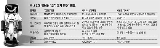 연말이면 찾아오는 단골 레퍼토리, '호두 왕자'가 더욱 힘차고 젊어졌다. 내달 일제히 막을 올릴 국내 3대 발레단의 '호두까기 인형'〈표 참조〉은 소녀가 선물 받은 호두까기 인형과 환상 여행을 떠난다는 줄거리는 비슷하지만, 발레단마다 개성이 뚜렷하다. 가장 남성적이고 웅장한 호두까기를 선보일 국립발레단의 새로운 왕자 3명을 만났다.
