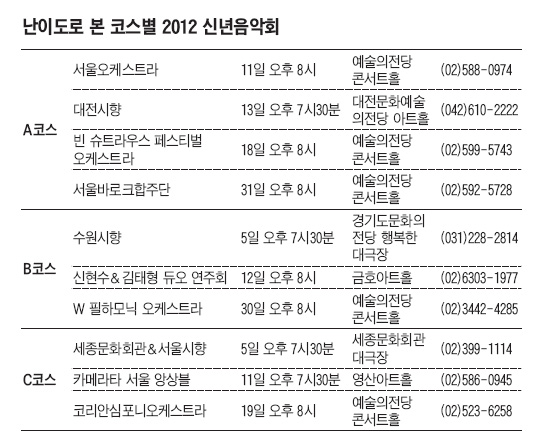 클래식이 낯설어 부담 없이 들을 수 있는 음악회를 찾는다면 요한 슈트라우스 2세의 '아름답고 푸른 도나우강' 등 낯익은 곡들로 꾸며진 전체관람가 코스를, 클래식에 어느 정도 관심이 있어 적당한 깊이를 맛보고 싶다면 라흐마니노프의 '교향곡 2번' 등을 들을 수 있는 도전자 관람가 코스를, 자타공인 애호가라면 말러 교향곡으로 채워진 마니아 이상 관람가 코스를 추천한다.(공연 일정은 표 참조)