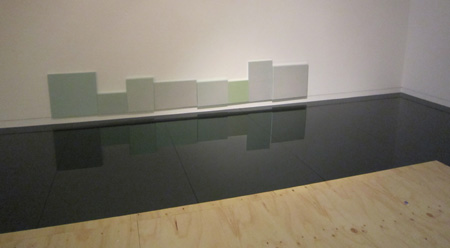 찰랑거리는 물인 줄 알고 발을 담가볼까 했더니, 까만 유리였다. 내달 3일까지 서울 사간동 금호미술관에서 개인전 'Scape Drawing'을 여는 김태호(59·서울여대 교수)는 미술관 3층 전시장 바닥에 검정 유리를 깔고, 군데군데 데크(deck)를 설치했다. 관객의 얼굴, 주변 사물을 그대로 비추는 유리 바닥이 연못 같은 착시효과를 주는 이 전시장 벽엔 다양한 크기의 은은한 연두색과 핑크색 캔버스 15점이 설치됐다.<사진> 캔버스 표면은 그저 단색. 어떤 형태도 그려져 있지 않지만 김태호는 "이 캔버스에는 무수한 풍경이 담겨 있다"고 말했다. "나무, 집, 바람…. 주변의 수많은 사물을 그렸다. 그린 위에 겹쳐 그리기를 수천 번을 반복했다."