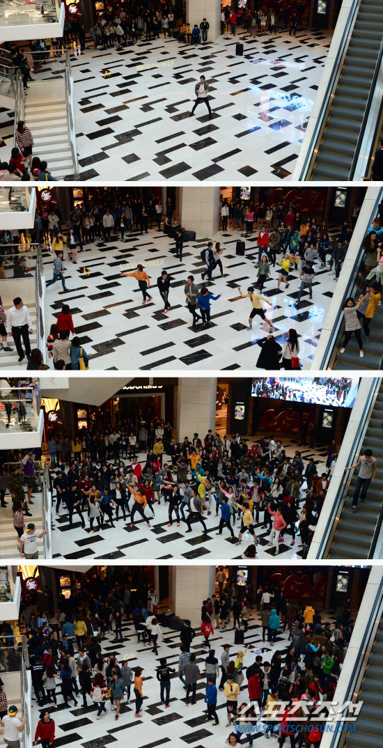 '이게 무슨 일인가?' 궁금해하는 순간, 춤추던 댄서 옆을 지나가던 또다른 젊은이들이 하나 둘씩 합류한다. 둘 셋 모이던 인파는 어느새 로비를 가득 채운다. 로비 뿐이 아니다. 에스컬레이터에서, 계단에서, 2층 난간에서 수백명의 젊은이들이 뮤지컬 '토요일밤의 열기'의 대표곡 '나이트 피버'에 맞춰 신나는 율동으로 하나가 된다. 노래의 절정에서 일사불란하게 공중으로 손을 찌르는 화려한 장관이 연출되자 여기저기서 "예쁘다" "멋있다" 등의 탄성이 터져나온다. 볼거리를 놓칠새라 재빠르게 휴대폰 동영상에 담거나, 함께 몸을 흔들며 즐거워하는 사람들도 많았다.