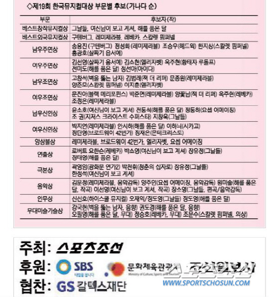 GS칼텍스 제19회 한국뮤지컬대상 시상식이 오는 10월 7일 오후 5시20분 경희대 평화의전당에서 열린다.