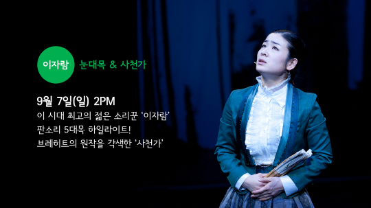 7일 오후 2시엔 이자람이 '눈대목 & 사천가' 하이라이트 공연을 선사한다. 중요무형문화재 제5호 판소리 이수자로 우리 시대 최고의 젊은 소리꾼인 이자람이 정통 판소리 5대목 하이라이트와 자신이 히트시킨 신세대 판소리 '사천가'(브레히트 작)의 명장면을 보여준다. 때로는 애절하게 때로는 역동적으로' 펼쳐내는 이자람의 에너지를 만끽할 수 있다. 고수 김홍식, 악사 장혁조 이향하 신승태가 함께 한다.