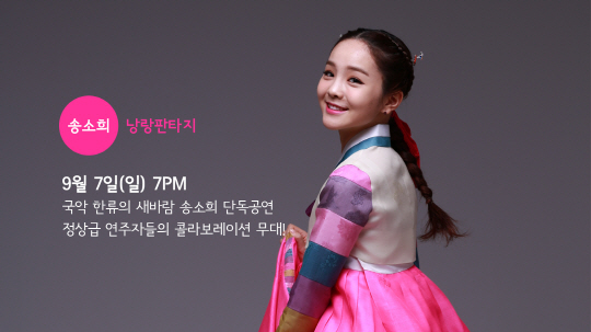 7일 오후 7시엔 송소희의 '낭랑 판타지'가 펼쳐진다. 국악 한류의 새바람을 일으키고 있는 송소희의 첫 번째 콘서트다. KBS '불후의 명곡'에서 압도적인 가창력과 깊은 울림으로 대중의 관심을 받으며 '현대음악의 보배'라는 극찬을 받은 송소희가 전통 국악, 오케스트라, 재즈, 사물놀이와의 크로스오버를 보여준다. 모스틀리 오케스트라, 김희현&프렌즈가 협연한다.