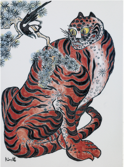 800도에서 초벌 작업을 한 도자 위에 그림을 그리고 유약을 바른 뒤 다시 1300도 가마의 열로 구워낸다. 도자라는 캔버스 위에 과감한 구도와 힘 있는 필치, 화려한 색채감으로 한국인의 일상적인 미의식을 한껏 드러낸다. 여기에 꿈과 이야기가 있는 민화의 상징성을 강하게 표현해 차가우면서도 열정적이고 호방하면서도 사랑스러운 자신만의 예술세계를 완성했다. 민화의 전통 위에서 자신만의 창의성을 가미한 것. 이번 전시에서는 대표작인 '소나무와 호랑이'를 비롯한 도자기 페인팅 작품 60여 점을 만날 수 있다.