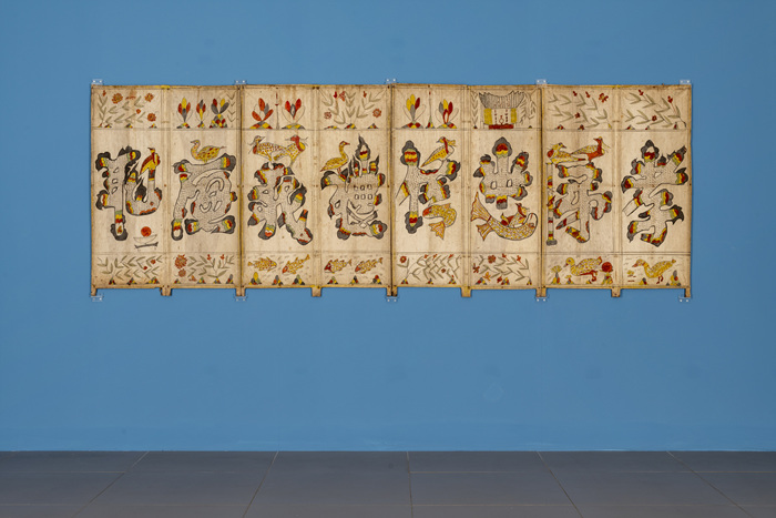 2층 전시실에서는 기본적인 효제문자도를 바탕으로 제주도의 자연과 토속적인 문화가 적극 반영된 <제주문자도>를 모아 선보인다. ‘바다·섬·하늘’을 떠올리는 3단 구성을 취하는 제주문자도는 상단과 하단에 제주도의 자연환경이 담긴 건물과 기물이, 중앙에는 새나 물고기의 형상을 띤 문자가 배치돼 있단. 제주도식으로 변용된 제주문자도는 조선시대 유교문자도가 전국으로 확산되고 각 지역의 토속적인 문화와 결합하여 지방예술로 자리매김한 양상을 보여준다.