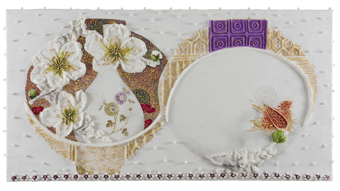 이번 전시 출품작들은 종이 부조 위에 수묵과 채색이 어우러진 작업들로, 색다른 구성과 표현력을 배가시킨 그만의 강렬한 색채 감각을 엿볼 수 있다. 또한, 독창성의 상징인 태극기의 S자 곡선으로 화면을 나누고 시공간을 초월한 듯한 오방색의 무작위적인 점들이 환상적으로 느껴지는데 그 가운데에 국보로 지정된 항아리를 백자 달항아리 속에 그려 넣어 새로운 세대의 감성으로 재구성한 참신한 발상이 돋보인다.