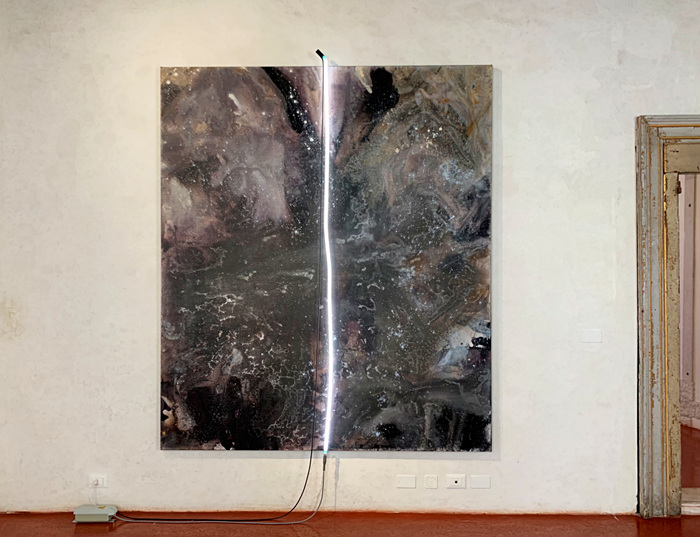 바젤리츠 관람 후 한층 올라가면 메리 웨더포드의 개인전 ‘The Flaying of Marsyas’이 펼쳐진다. 웨더포드는 베니스 출신의 작가 티치아노(Titian)의 동명의 회화 ‘The Flaying of Marsyas’에서 영감을 받은 신작을 선보인다. 웨더포드는 은유적인 제스처가 깃든 화면에 그 위를 가로지르는 네온튜브를 부착한 스타일의 작품으로 컬렉터들 사이에서 인기인 작가다. 티치아노의 원작에서 드러나는 다소 폭력적인 분위기를 웨더포드는 추상적으로 풀어냄으로써 인간과 신, 운명 등과 같은 주제를 암시하고 있다. 화면 위의 발광하는 네온튜브가 칠흑처럼 어두운 우주 속의 빛나는 별처럼 보인다.