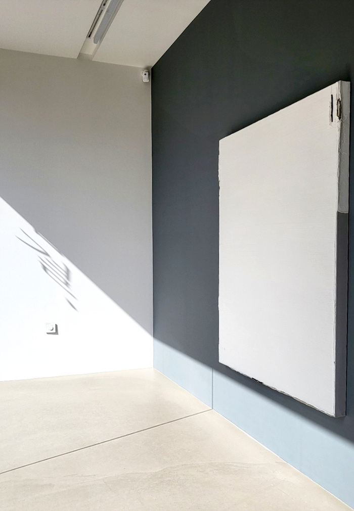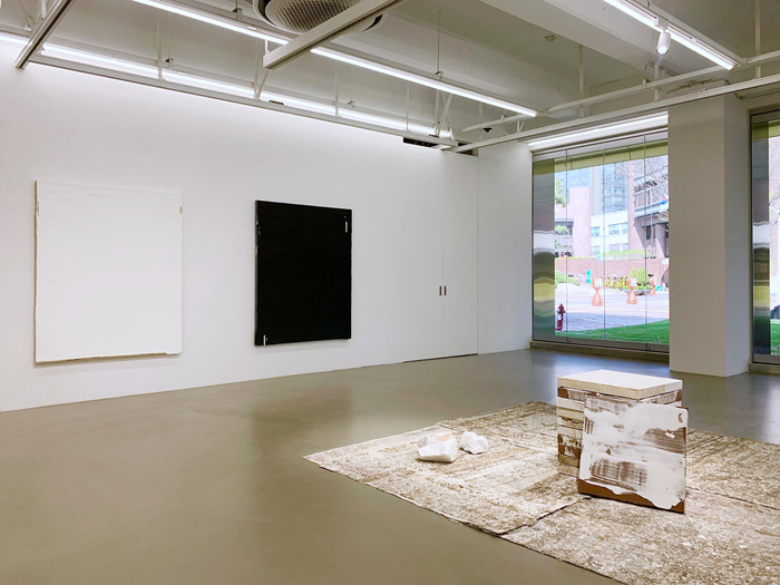 또 다른 출품작이자 작가가 한국에서는 처음 선보이는 설치작 ‘2022-179’(2022)도 눈여겨봄 직하다. ‘숨’ 작업의 캔버스를 층층이 쌓은 것으로, 연작의 주요한 재료인 석분의 배합 농도 등을 맞추기 위한 시뮬레이션과 테스트의 흔적이다. 아울러, 실제 그의 작업실 바닥에 깔린 광목천을 가져와 이들과 함께 설치함으로써 작가의 작업하는 모습을 상상할 수 있도록 했다. 흥미로운 연출을 통해 물질적 속성을 캔버스 위로 옮기고자 한 작가의 의도를 헤아려볼 수 있다.