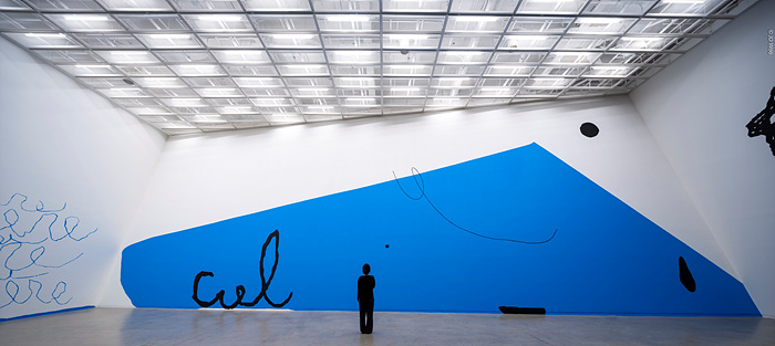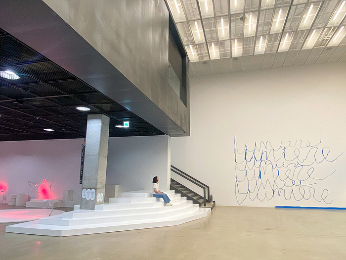 인트로인 ‘마당’에서는 김동희, 양지원이 참여한다. 김동희는 수원시립미술관 자체를 작업의 재료로 삼으며 전시실의 계단을 연장한 단상 ‘걸터앉는 암벽’(2023), 로비의 카페테리아 기둥을 둘러싼 원형 벤치 ‘둘러앉는 바위’(2023), 전시장 내부와 미술관 로비에 배치한 정사각형 이동식 의자 작품 등을 통해 공간과 어우러진다. 양지원은 9미터의 사선 벽에 거대한 하늘을 뜻하는 단어 ‘Ciel’을 적은 벽화 작업과 역동적인 이미지를 드로잉 방식으로 표현해 끊임없이 순환하는 하늘을 표현했다.