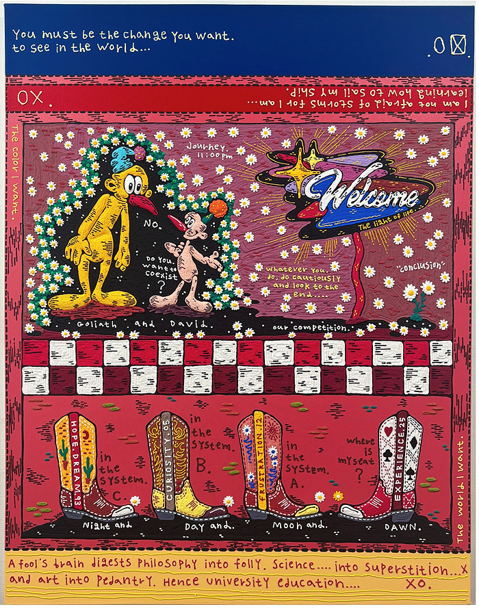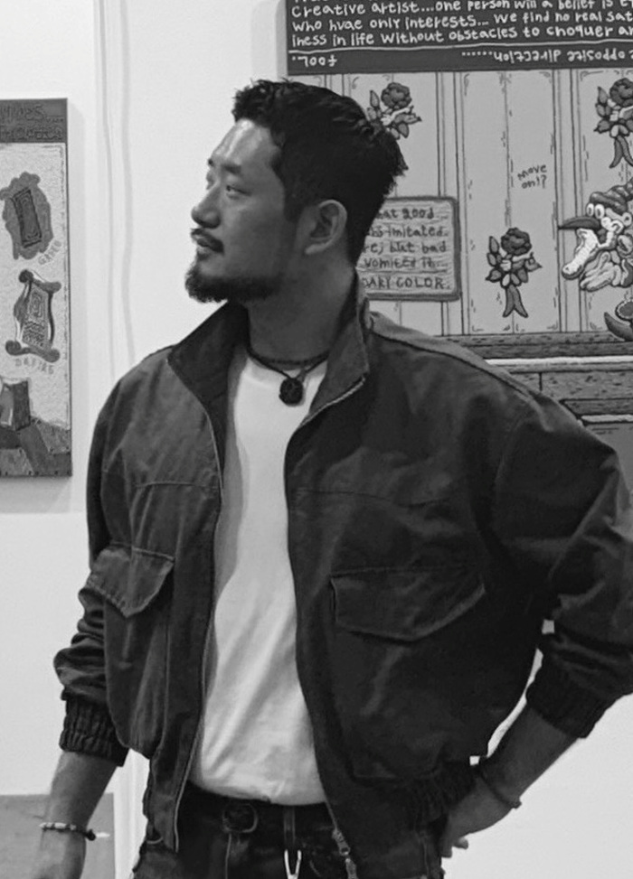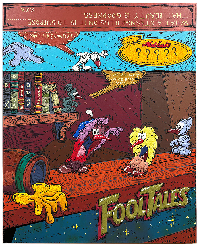 FOOL에게 회화는 단순한 이미지가 아니라, 노동이자 물리적 저항의 행위다. 액체인 물감을 고체처럼 작업에 활용하는 과정은, 마치 전통적 틀을 벗어나 새로운 회화의 언어를 만들어가겠다는 시도와 같다. 작가는 “내게 작품은 비워내는 과정이다. 그래야 비로소 각자의 내면을 행복감으로 채울 수 있다”라고 말한다.