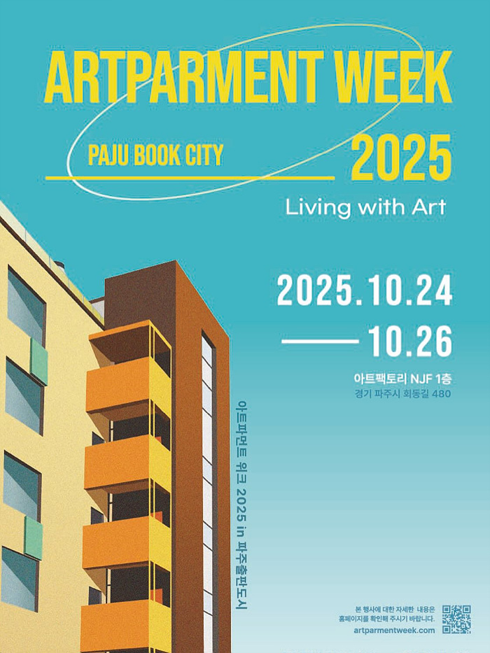 파주출판도시 아트팩토리 NJF에서 도시재생 예술축제 ‘Artpartment Week 2025’가 오늘 개막해 26일까지 열린다. ‘Artpartment’는 미술을 뜻하는 아트(Art)와 아파트(Apartment), 그리고 엔터테인먼트(Entertainment)의 합성어로 도시와 사람을 잇고, 예술과 일상이 함께하는 아트 아파트 단지라는 뜻을 지닌 새로운 형태의 복합 문화예술 축제다.