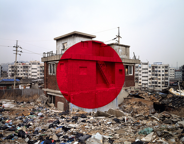 작가는 당시를 회상하며 다음과 같이 전한다. “2000년, 성곡미술관에서 열린 동방의 빛 전을 준비하며 98년, 처음 한국을 방문했습니다. 서울 한복판에서 철거를 앞둔 낡은 양옥집 외벽에, 사라질 공간을 기념하기 위해 붉은 원을 그렸습니다. 나에게 붉은색은 사진에 필요한 태양빛을 상징합니다. 이 작품은 폐허의 어둠 속에서 빛을 상징하는 제 방식의 인사였습니다.”