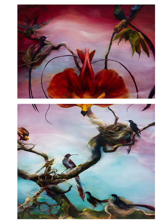 이번 전시는 2024년작 <Tree of Stuffed Hummingbirds>에서 출발한다. 나뭇가지가 뱀의 머리로 변하고, 벌새 표본들이 놀라 흩날리는 장면은 정지된 화면에 사건성을 부여한다. 작가는 이러한 서사적 긴장 속에서 이미지 간의 관계와 흐름을 구성하며, 재현의 영역을 넘어서는 서사적 회화의 가능성을 실험한다.