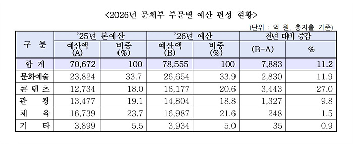 최근 세계로 수출되는 K-콘텐츠 시류에 힘입어 문화체육관광부의 2026년도 예산이 7조 8555억 원으로 증가했다. 이는 올해 본예산 대비 7833억 증가한 규모다. 문체부는 이번 예산을 ‘케이-컬처’ 300조 원 시대 출발을 위한 예산으로 콘텐츠산업의 국가전략산업화, 국민이 함께 누리는 관광 등에 주력해 편성했다고 밝혔다.