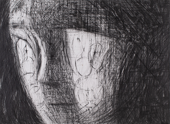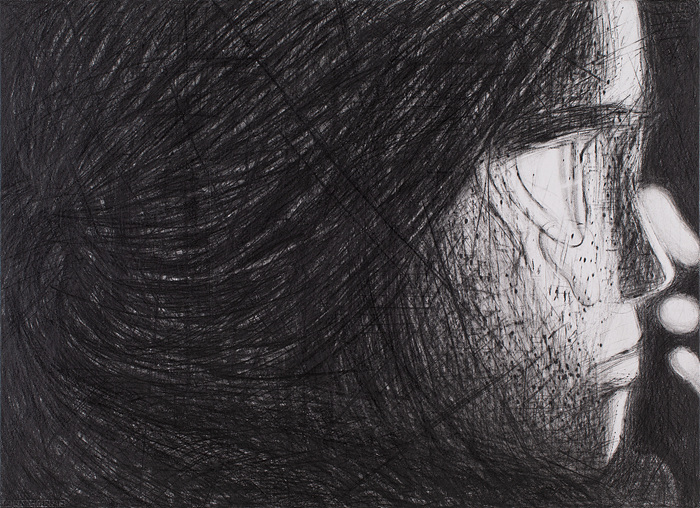 이번 전시에서는 크게 드로잉 연작과 페인팅들을 함께 만나볼 수 있다. 먼저, 모노톤의 연필 드로잉 연작 〈그을린 소녀〉는 딥페이크 성범죄 사건 피해자의 고통에 대한 연대의식에서 출발하였다. 영상 속 인물은 실존하는 이의 얼굴과 낯선 몸이 합성된 가짜 이미지, 즉 가상에서 비롯되었으나 그로 인해 발생한 고통은 현실에 분명 실재한다. 날카로운 선들과 검은 격자로 표현된 그을음, 인물의 눈에서 분출되는 눈물과 불꽃은 끊임없는 고통의 상태를 상징한다.