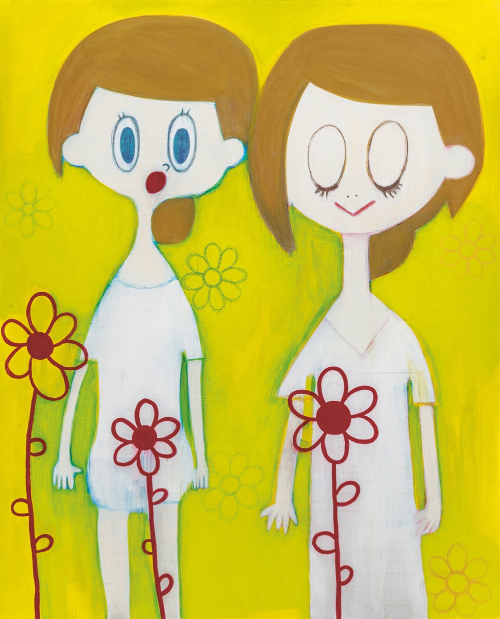 제목이 없는 이번 출품작 3편은 호소카와가 평소 보여준 디테일한 묘사보다는 인물에 초점을 둔 것이 특징이다. 호소카와의 작품에 자주 등장하는 인물들은 둥글고 큰 눈, 가늘고 긴 팔과 다리를 가지고 있다. 이는 몰개성한 모습으로 살아가는 현대인의 표상이며, 동시에 시대상을 담고 있다. 특히 2025년에 작업한 근작의 경우엔 과감히 비워내거나 단순화하고, 인물의 시선과 표정, 그리고 화면의 여백을 통해 감정의 밀도를 끌어올리는 방향으로 나아간다. 장식적 요소를 덜어낸 대신 인물 자체가 하나의 상징처럼 부각되며, 관람자는 그 공백 속에서 불안과 고독, 혹은 미묘한 유머를 스스로 읽어내게 된다. 이는 이전 작업에서 보이던 서사적 장치들이 내면으로 수렴되며, 보다 응축된 방식으로 감정을 전달하려는 시도로 해석된다.